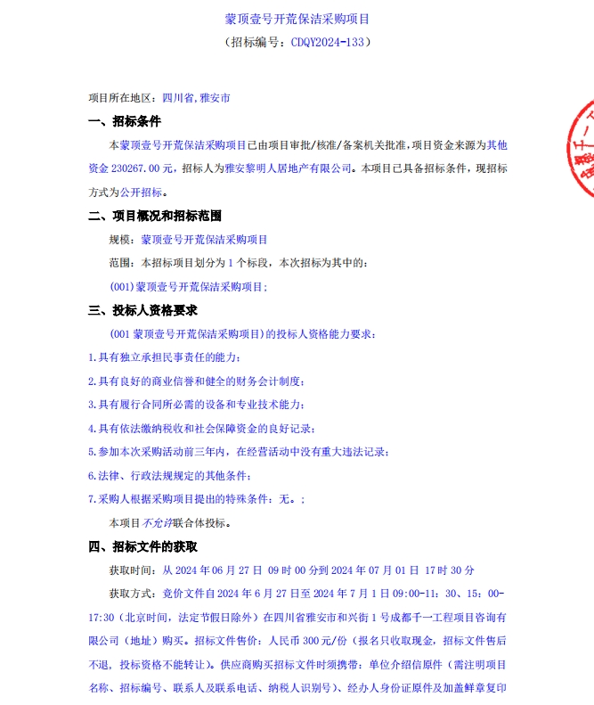 蒙頂壹號(hào)開(kāi)荒保潔采購(gòu)項(xiàng)目公告