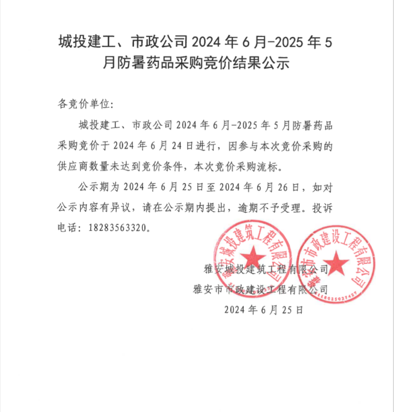 城投建工、市政公司2024年6月-2025年5月防暑藥品采購競價結果公示