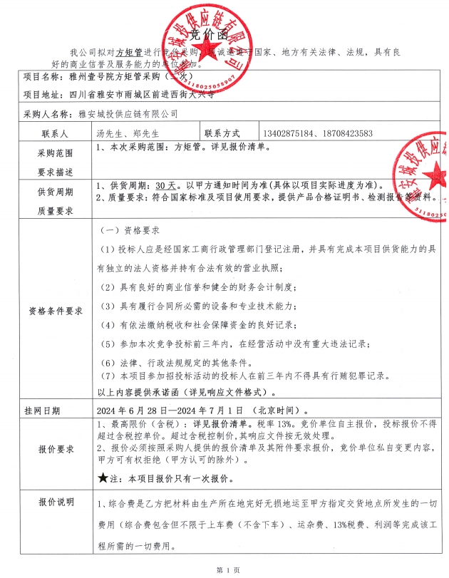 附件1:競(jìng)價(jià)函--雅州壹號(hào)院方矩管采購(gòu)(二次)
