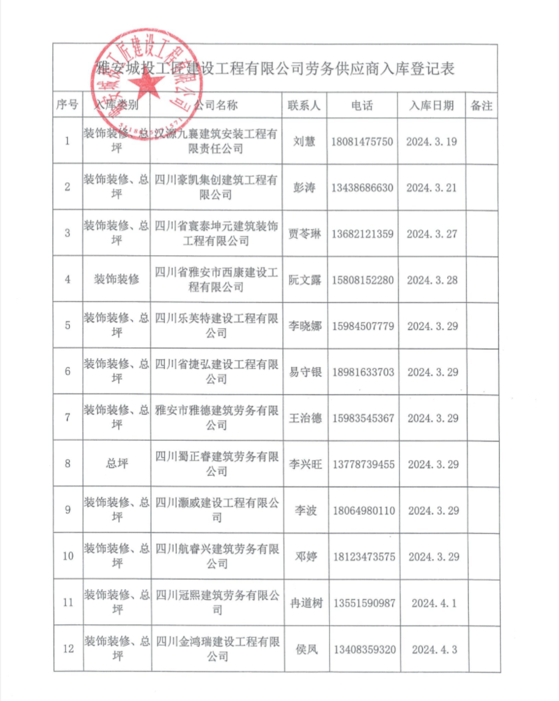 雅安城投工匠建設工程有限公司勞務供應商入庫登記表