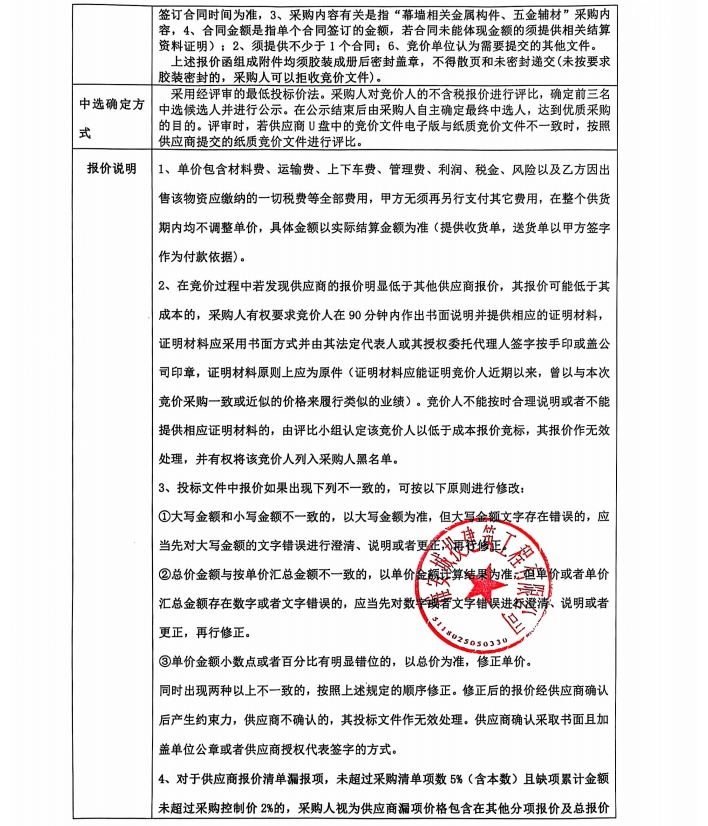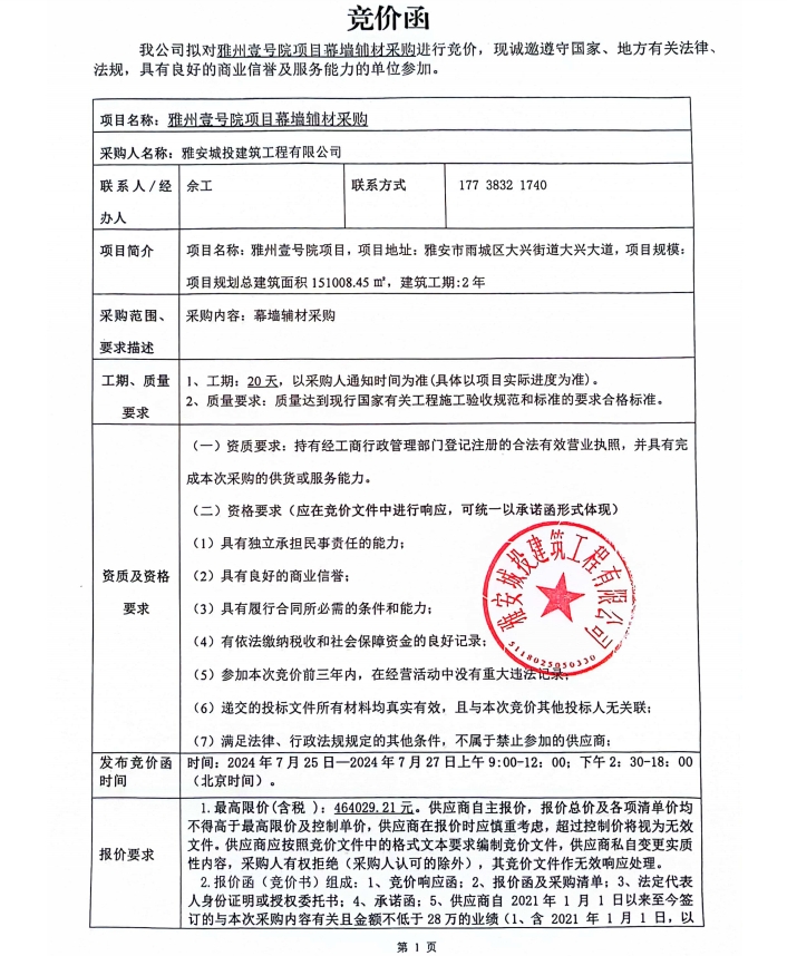 雅州壹號院項(xiàng)目幕墻輔材采購競價(jià)公告