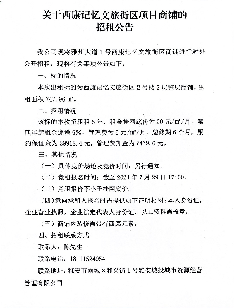 關(guān)于西康記憶文旅街區(qū)項目商鋪的招租公告