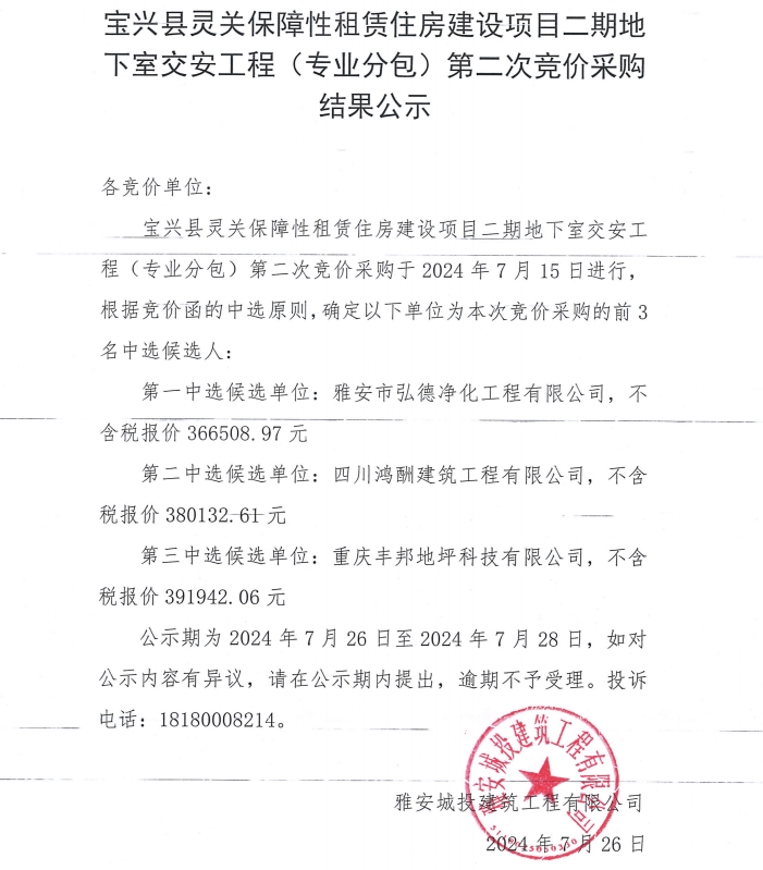 寶興縣靈關保障性租賃住房建設(二期)地下交安工程(專業(yè)分包)第二次競價采購結果公示