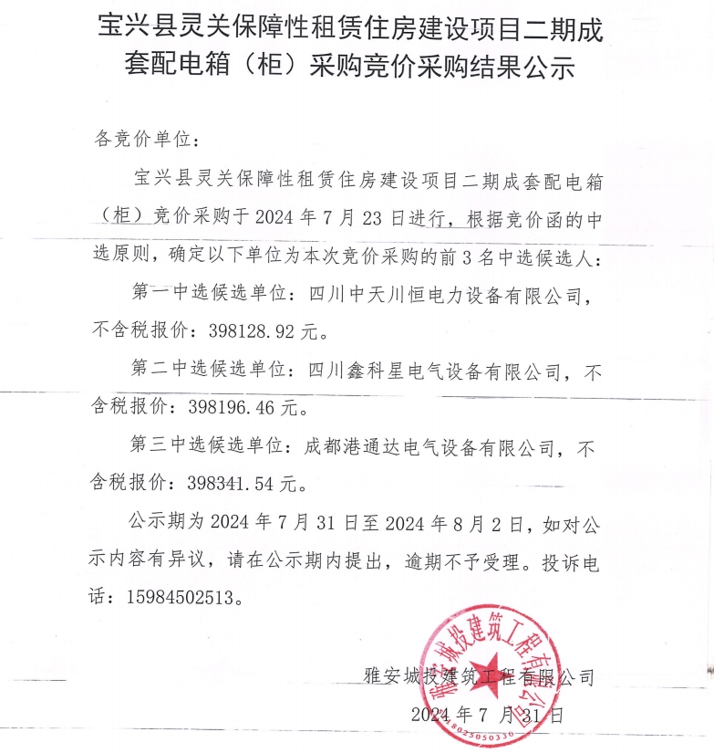 寶興縣靈關(guān)保障性租賃住房建設(shè)項(xiàng)目二期成套配電箱(柜)采購競價采購結(jié)果過公示