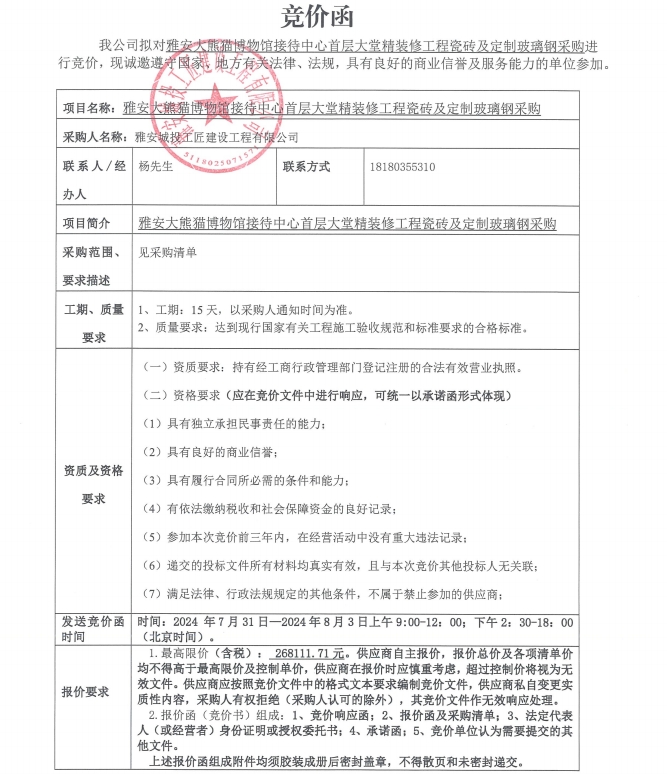 雅安大熊貓博物館接待中心首層大堂精裝修工程瓷磚及定制玻璃鋼采購競價公告