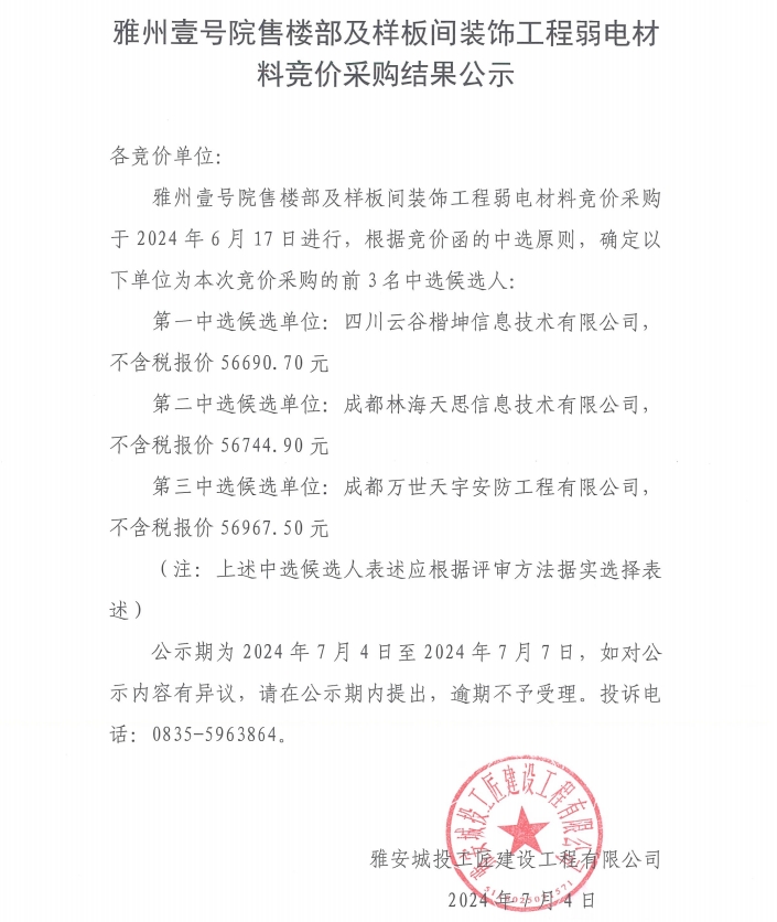 雅州壹號院售樓部及樣板間裝飾工程弱電材料競價采購結果公示