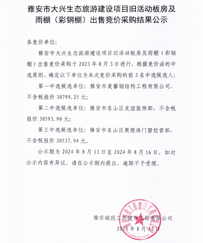 雅安市大興生態(tài)旅游建設(shè)項(xiàng)目舊活動板房及雨棚(彩鋼棚)出售競價(jià)采購結(jié)果公示
