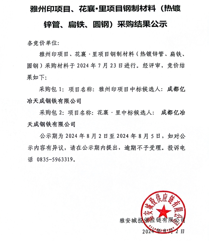 雅州印項目、花襄·里項目鋼制材料(熱鍍鋅管、扁鐵、園鋼)采購結果公示