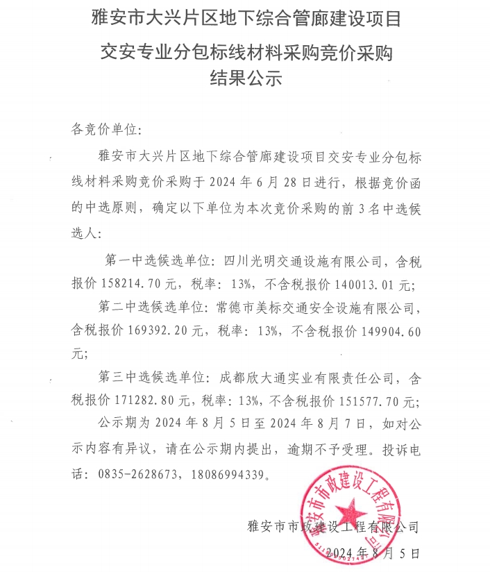 雅安市大興片區(qū)地下綜合管廊建設(shè)項目道路專業(yè)分包標(biāo)線材料采購競價采購結(jié)果公示