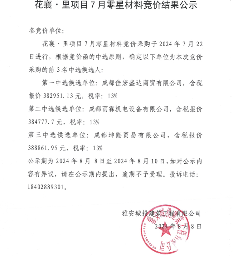 花襄·里項目7月零星材料競價結(jié)果公示