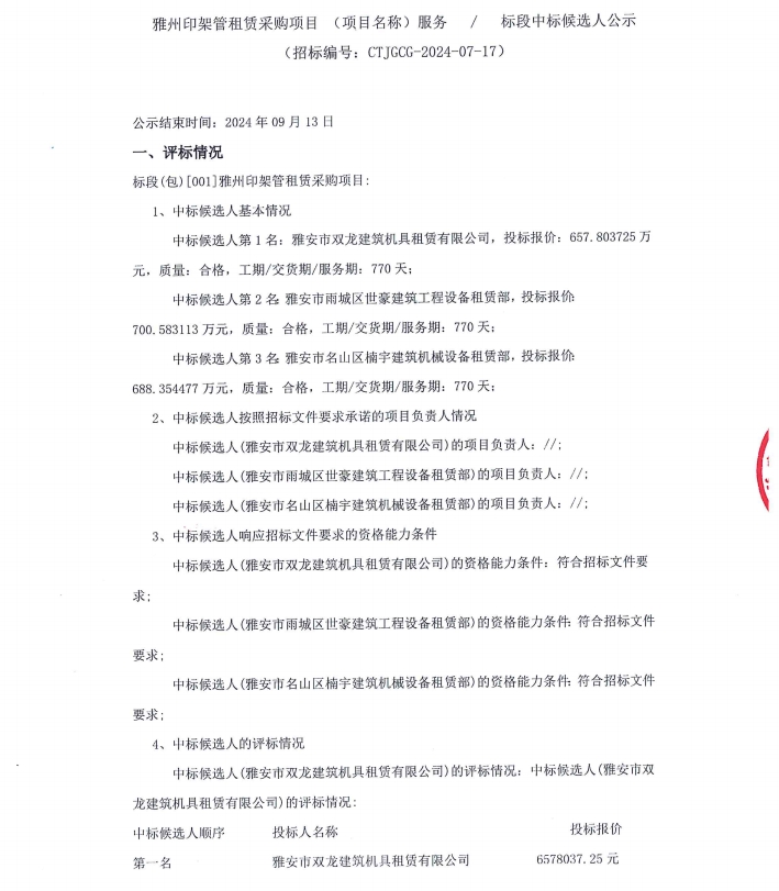 雅州印架管租賃采購項目(項目名稱)服務/標段中標候選人公示公告