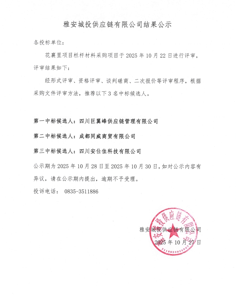 雅安城投供應鏈有限公司花襄里項目欄桿材料采購結果公示