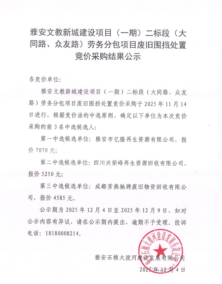 雅安文教新城建設項目(一期)二標段(大同路、眾友路)勞務分包項目廢舊圍擋處置競價采購結果公示