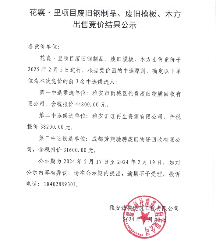 花襄·里項(xiàng)目廢舊鋼制品、廢舊模版、木方出售競價結(jié)果公示