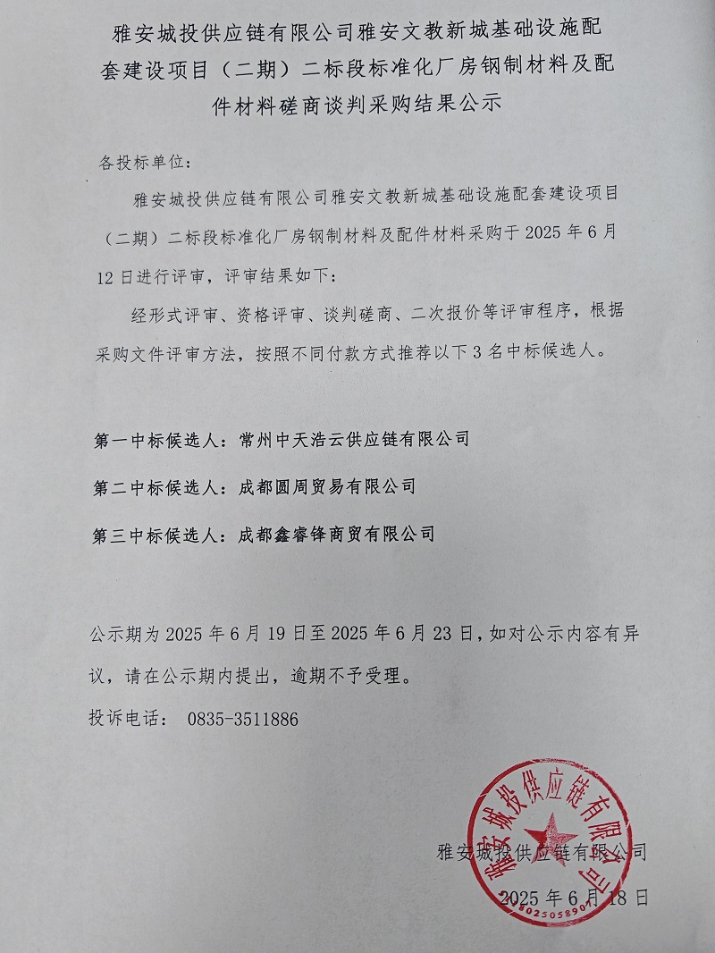 雅安城投供應鏈有限公司雅安文教新城基礎設施配套建設項目(二期)二標段標準化廠房鋼制材料及配件材料磋商談判采購結果公示