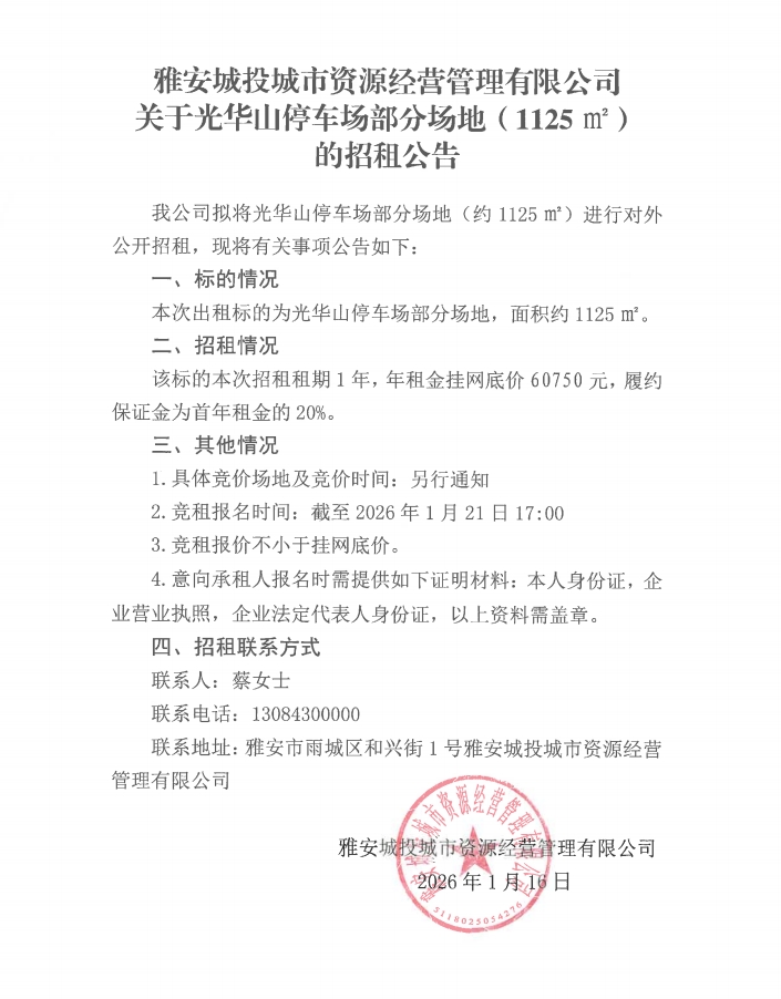 雅安城投城市資源經營管理有限公司關于光華山停車場部分場地(1125㎡)的招租公告