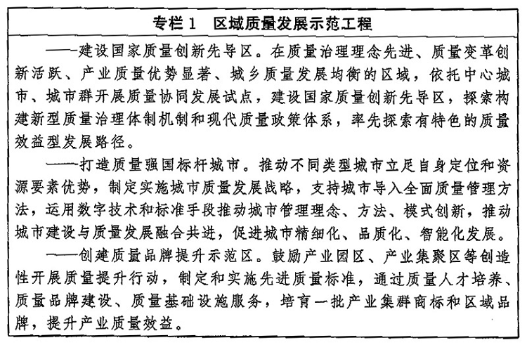 (九)打造區(qū)域質(zhì)量發(fā)展新優(yōu)勢。加強質(zhì)量政策引導,推動區(qū)域質(zhì)量發(fā)展與生產(chǎn)力布局、區(qū)位優(yōu)勢、環(huán)境承載能力及社會發(fā)展需求對接融合。推動東部地區(qū)發(fā)揮質(zhì)量變革創(chuàng)新的引領帶動作用,增強質(zhì)量競爭新優(yōu)勢,實現(xiàn)整體質(zhì)量提升。引導中西部地區(qū)因地制宜發(fā)展特色產(chǎn)業(yè),促進區(qū)域內(nèi)支柱產(chǎn)業(yè)質(zhì)量升級,培育形成質(zhì)量發(fā)展比較優(yōu)勢。推動東北地區(qū)優(yōu)化質(zhì)量發(fā)展環(huán)境,加快新舊動能轉換,促進產(chǎn)業(yè)改造升級和質(zhì)量振興。健全區(qū)域質(zhì)量合作互助機制,推動區(qū)域質(zhì)量協(xié)同發(fā)展。深化質(zhì)量強省建設,推動質(zhì)量強市、質(zhì)量強業(yè)向縱深發(fā)展,打造質(zhì)量強國建設標桿。
